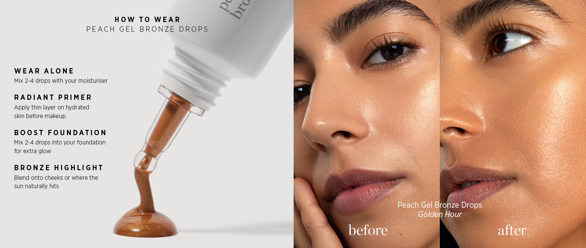 Use it your way: for a no-makeup glow, mix 2-4 drops into your favourite moisturiser, wear under foundation or apply solo for a natural face bronzing serum. Perfect for daily wear, even on acne-prone and sensitive skin, the clean and vegan formula contains peach extract, to help soothe and protect skin, and watermelon seed oil to deeply hydrate and rejuvenate - creating luminous, peach-perfect skin every time.